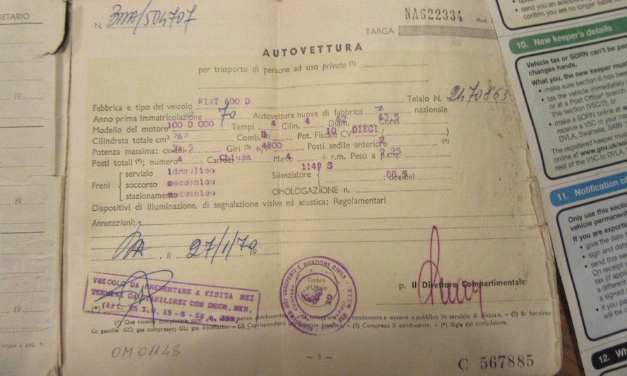 This charming example of the updated 600D model was first registered in Naples, and has spent much of it’s life in Italy under the registration number NA622334. The log book cover sheet is dated April 1970, suggesting that this is one of the last 600Ds to roll off the production line.