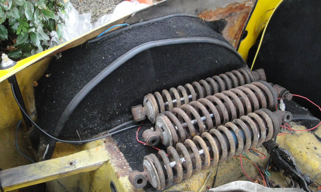 It appears that one front ‘corner’ (wishbones, upright, brakes etc.) has been partly refurbished while the other has sensibly been left intact, presumably for reference purposes. There is a used steering rack plus a new (or perhaps refurbished) one, still in its packaging. The rear suspension, driveshafts and brakes are complete and ready for restoration while there is a set of AVO adjustable shock absorbers with their associated springs and adjustable spring seats along with three apparently original spring/damper units. Catch tanks and pipework for the cooling system are present along with the wood dashboard and instruments in fair condition. Trimmed door panels in good condition are present along with the heated glass rear screen.