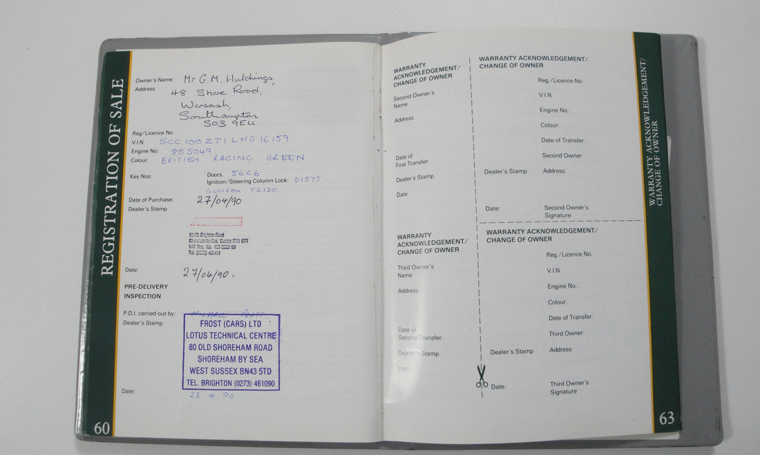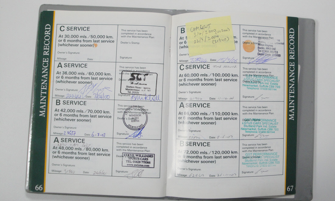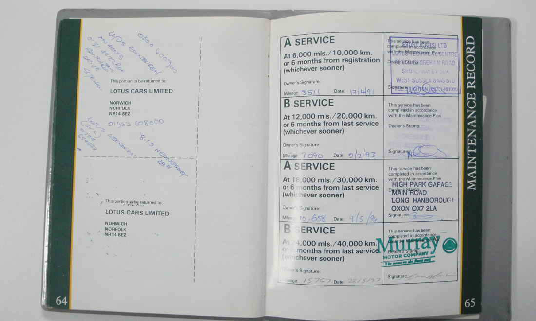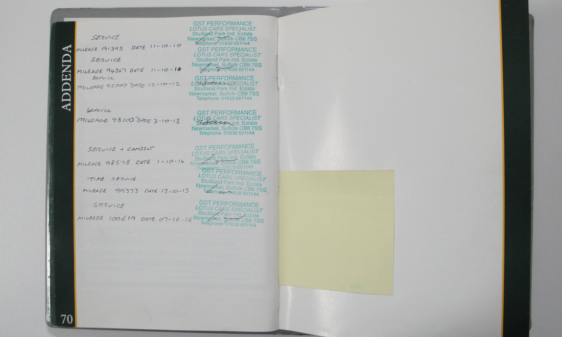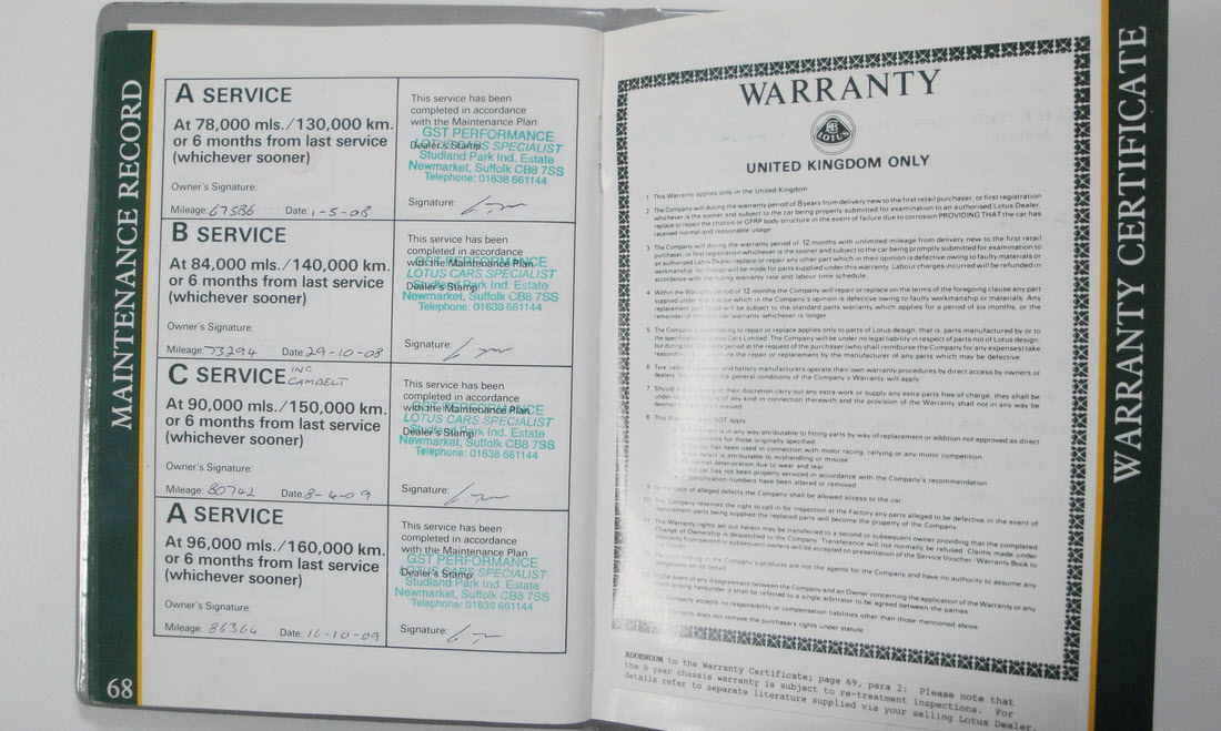 The car’s extensive History File contains a raft of invoices dating back to the early 1990s, a similarly comprehensive selection of MOT certificates including the current one valid until October, the Lotus Cars anti-corrosion guarantee and all important Owners Handbook/Maintenance Record plus the current V5C.